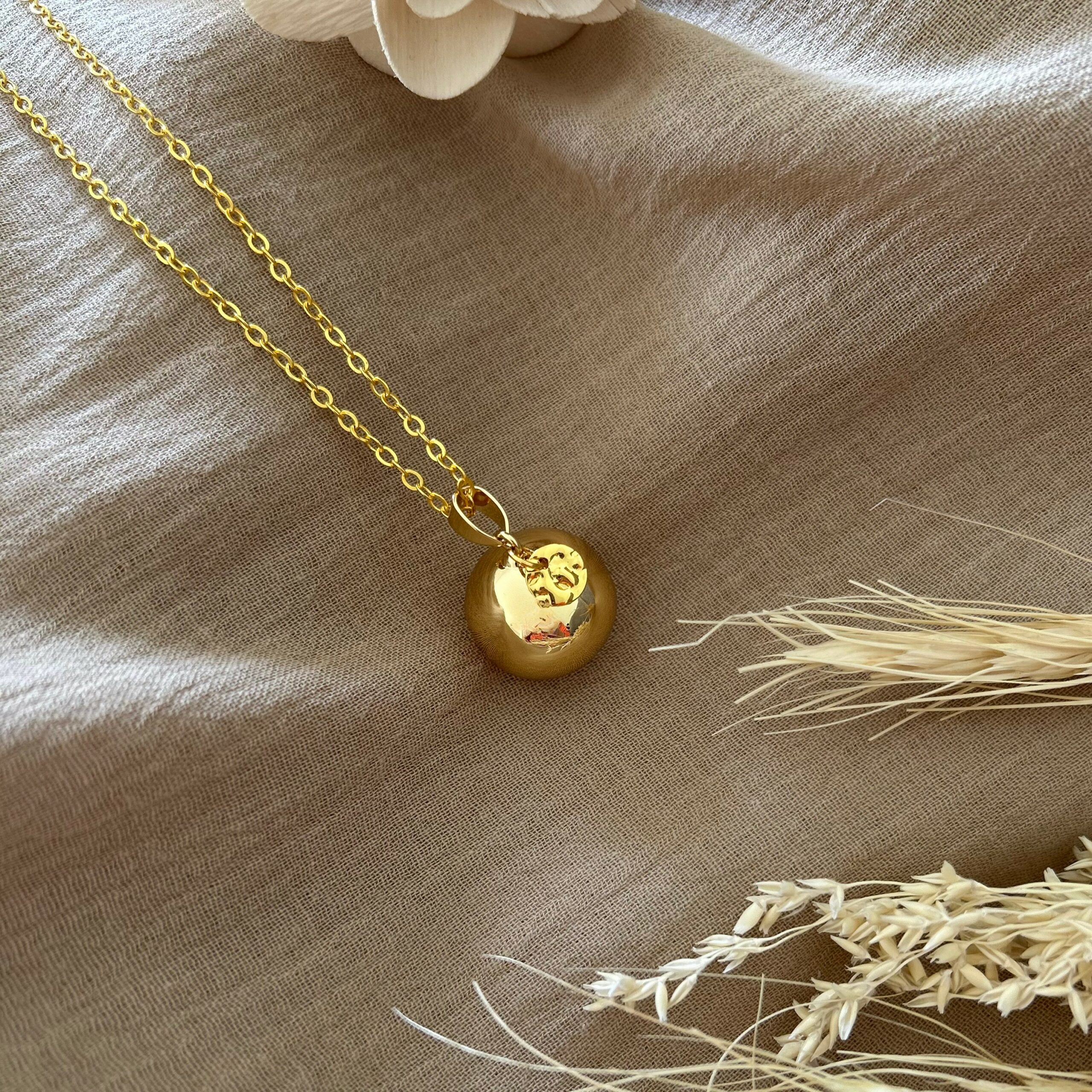 El llamador de ángeles es una joya tradicional que usan las mujeres embarazadas. Colgado sobre el vientre, contiene un pequeño cascabel que emite un suave tintineo relajante. Este sonido es percibido por el bebé desde la semana 19 de embarazo y lo calma durante toda la gestación.
