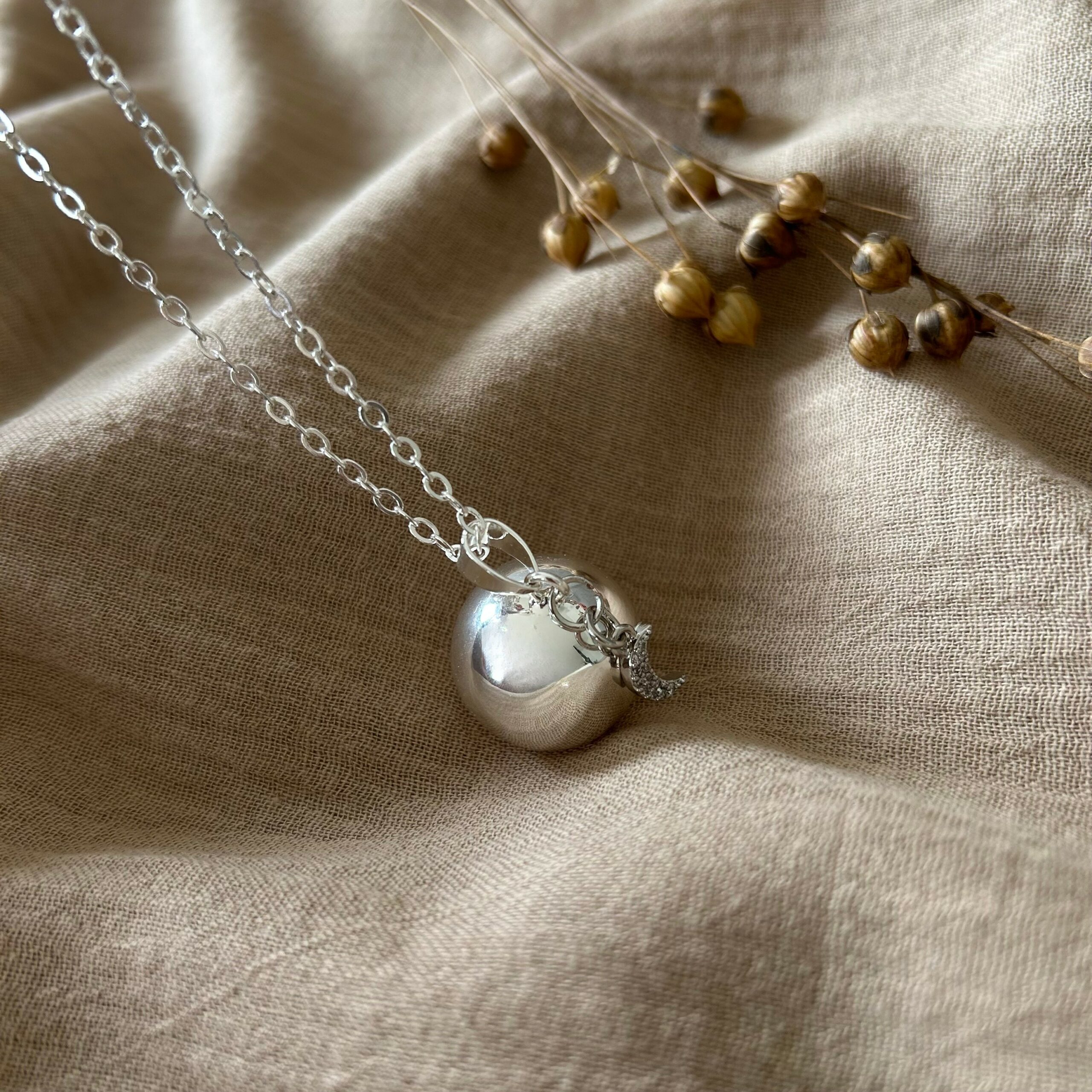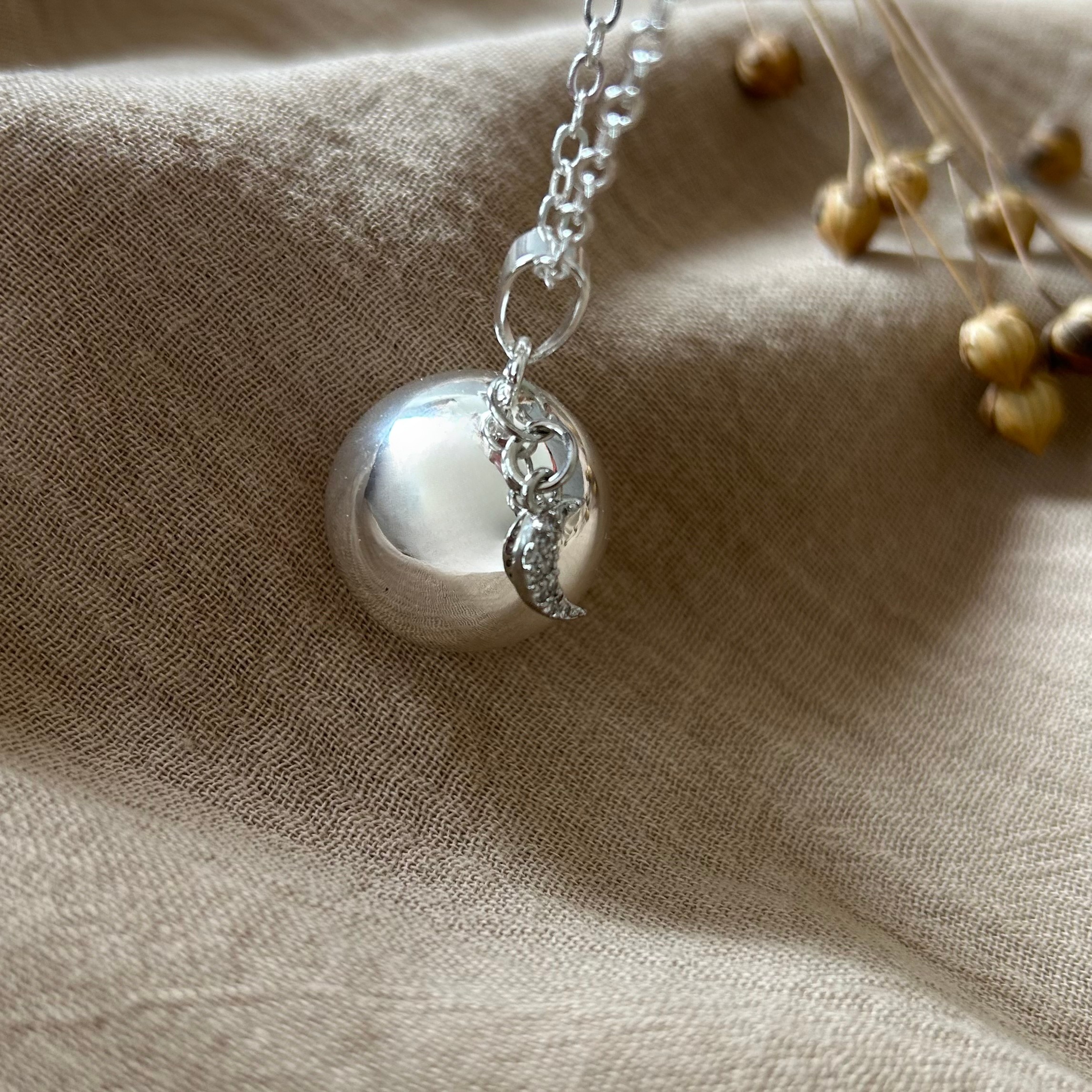 Ce bola argenté de 20mm est monté sur un cordon doré sombre ajustable, assurant un porté confortable et élégant pour la future maman. Sa forme ronde et brillante est agrémentée d’un charme lune, symbole de douceur, de sérénité et de protection, apportant une touche poétique à ce bijou unique.